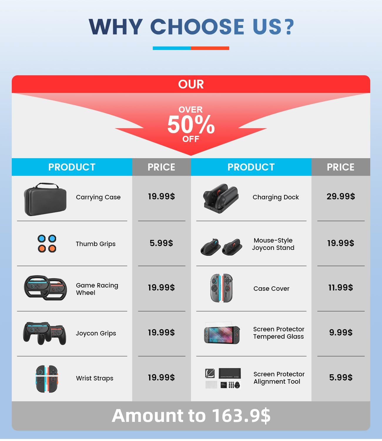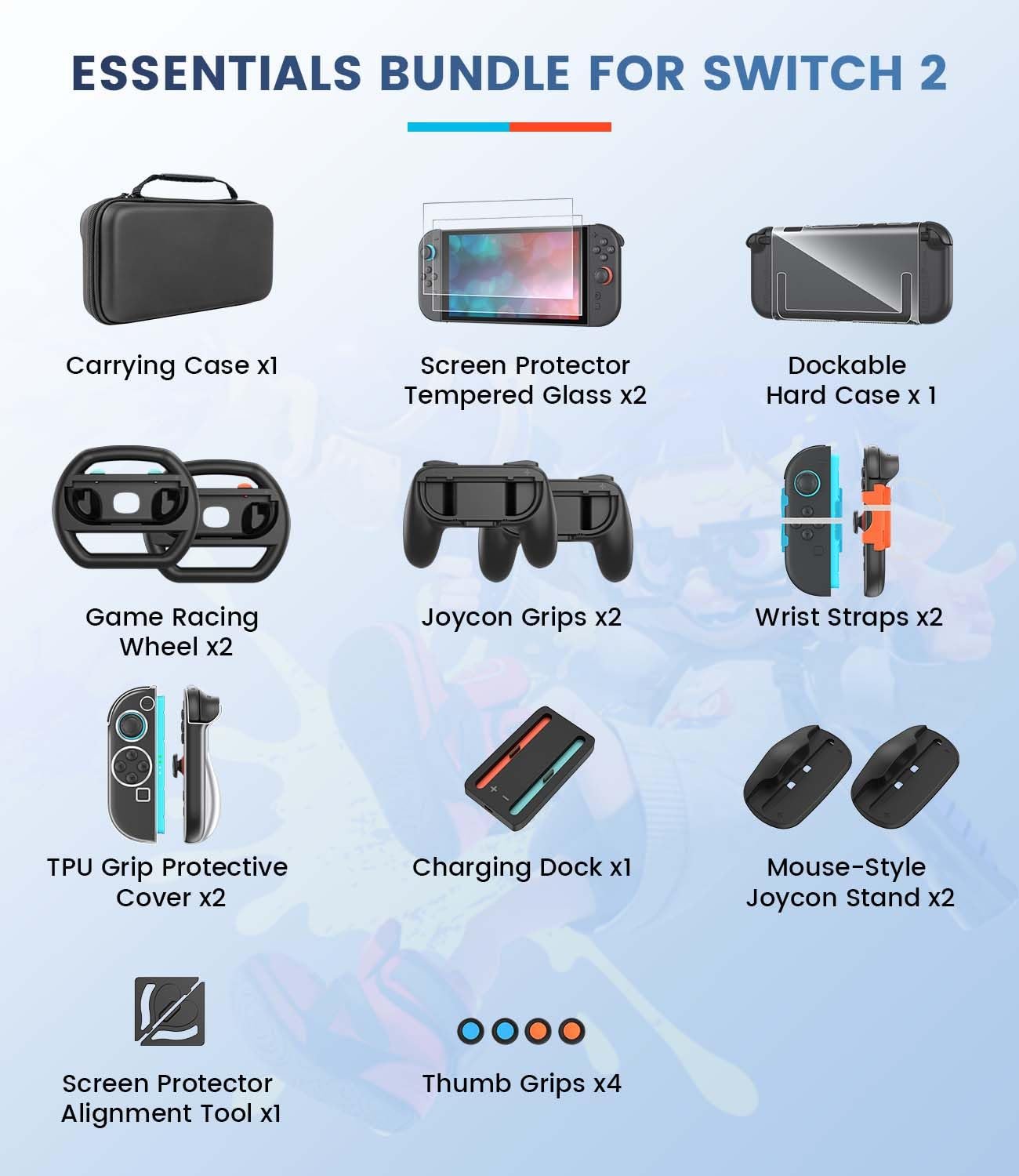- Your Complete Switch 2 Accessories Kit Includes: Carrying Case x1, Thumb Grips x4, Game Racing Wheel x2, Joycon Grips x2, Wrist Straps x2, Charging Dock x1, Mouse-Style Joycon Stand x2, Dockable Hard Case x1, TPU Grip Protective Cover x2, Screen Protector Tempered Glass x2, Screen Protector Alignment Tool x1. This all-in-one switch 2 accessories bundle upgrade shields your Switch 2, charges faster, grips smarter, and unleashes full gaming potential across every genre—ready for any adventure.