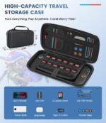 - Safeguard your Nintendo Switch 2 console in our Switch 2 carrying case with rugged EVA construction. The reinforced shell resists impacts/spills, while scratch-proof nylon zipper teeth protect console and Joy-Cons. Inside, mesh pockets organize Switch 2 thumb grips, wrist straps, earbuds, switch 2 charger cables, power bank etc, with a dedicated 12-slot card holder securing your game library. Dual zippers + silicone handle make this Switch 2 travel case effortlessly portable.